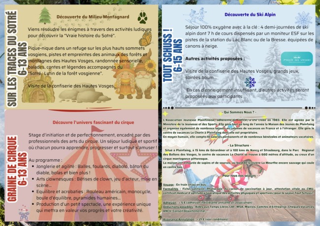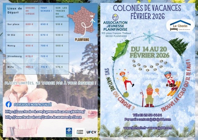 L’Association Jeunesse Plainfinoise, adhérente de l’UFCV a été créée en 1983. Elle est reconnue Association d’Education populaire et de Jeunesse par le Ministére de la Jeunesse et des Sports. Elle gère tout au long de l’année, au sein de la Maison des Jeunes de Plainfaing, des activités péri et extra scolaires pour les jeunes de la commune de Plainfaing et les jeunes des vallées de la Haute Meurthe. Elle organise également de nombreux séjours en colonies de vacances en France et à l’étranger. Elle gère le centre de vacances du Chorin à Plainfaing dont elle est propriétaire. En moyen humain, elle compte 5 salariés permanents, de nombreux bénévoles et animateurs vacataires.